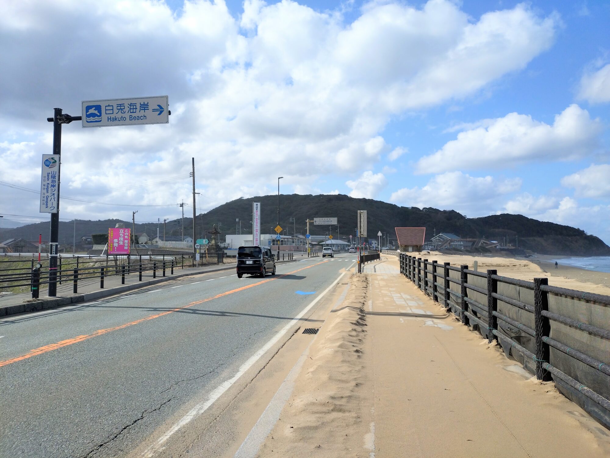 ひたすら景色を楽しみながら歩いていると、あっという間に白兎海岸まで1kmのところまできましたよ!(海岸沿いは国道で歩道がありません。もし歩かれる際には車の邪魔にならないよう、かなり端っこを歩くか歩道のある道を歩くようにしてくださいね。)